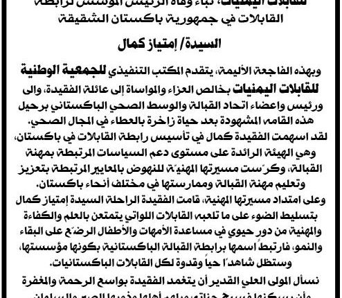 صنعاء – نعت الجمعية الوطنية للقابلات اليمنيات، وفاة مؤسسة رابطة القابلات الباكستانيات ورئيستها سابقا السيدة السيدة إمتياز كمال الذي وافتها المنية اليوم الجمعة، في بعد حياة زاخرة بالعطاء في المجال الصحي.